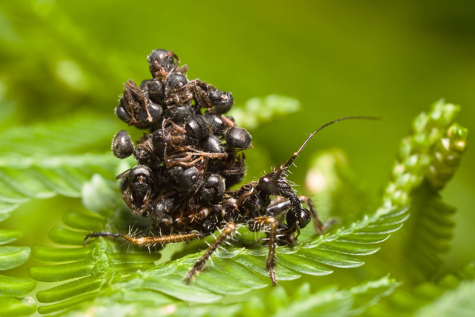 Certain assassin bugs of the genus Acanthaspis, found in Asia and Africa, have developed a particularly grisly form of camouflage: they decorate themselves with the corpses of their prey. After impaling and sucking their ant victims dry, the bugs use sticky threads to glue the empty exoskeletons onto themselves. Interestingly, though many of these assassin bugs eat a varied insect diet, only ants have been seen attached to their backs, and some species carry as many as 20 dead ants in a corpse pile often larger than the assassin bug itself. This grotesque disguise is thought to serve as both defense and deception. The mound of dead bodies distorts the bugs’ outlines, making them confusing and unrecognizable to such predators as jumping spiders. Ants are known to swarm and attack when threatened, so it may be that the visual display on the assassin bug looks like an intimidating swarm to a potential predator. Some researchers think that the scent of the dead ants may also play a role in this curious behavior, perhaps creating an olfactory warning to potential predators or helping the assassin bugs slip unnoticed among ants and other prey.